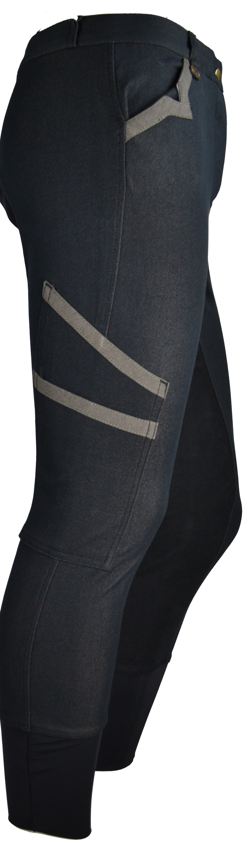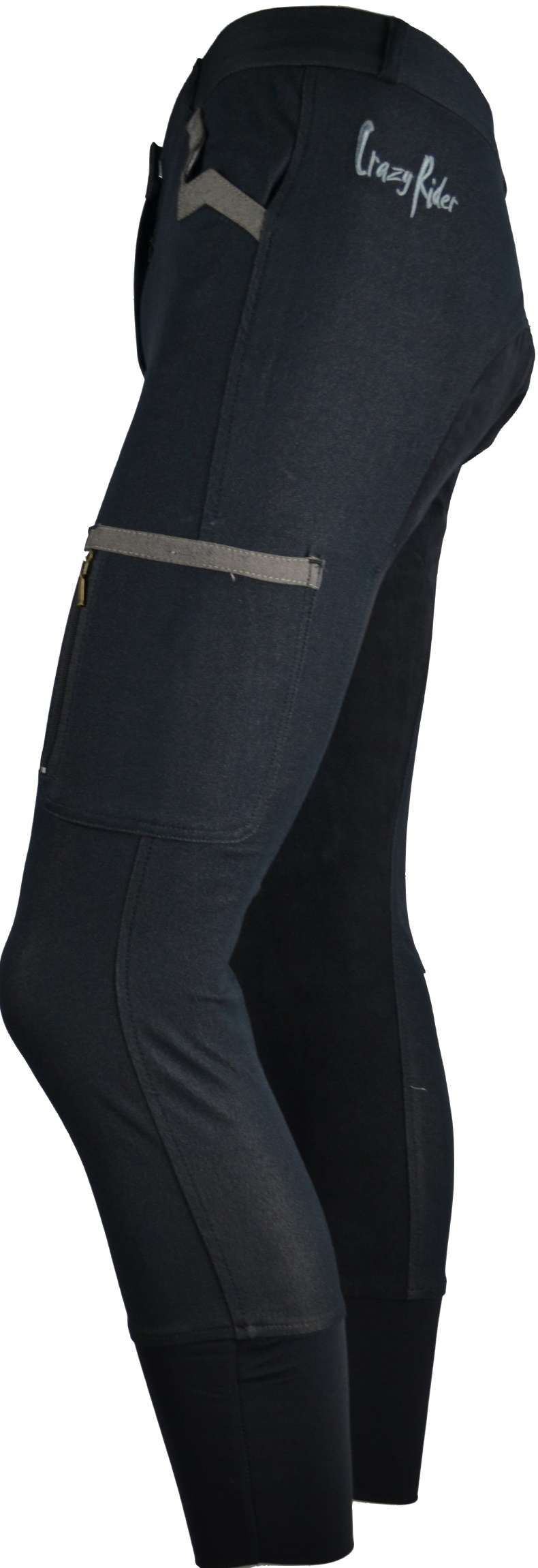 Diese aussergewöhnliche Reithose überzeugt durch viele Details, ihr tolles Design sowie ihr gemütliches Material. Die Vorderseite ist ausgestattet mit 2 praktischen Taschen, modisch aufgepeppt durch die Kontrastnähte. An beiden Oberschenkeln befinden sich praktische Einschubtaschen, in die man vom Hufauskratzer bis zur Karotte alles unkompliziert aufbewahren kann. Der Vollbesatz ist aus strapazierfähigem Imitatleder und bietet optimalen Schutz und Halt im Sattel. Die Beinenden liegen mithilfe des elastischen Bundes hauteng an, was Faltenbildung und Druckstellen im Stiefel vermeidet.